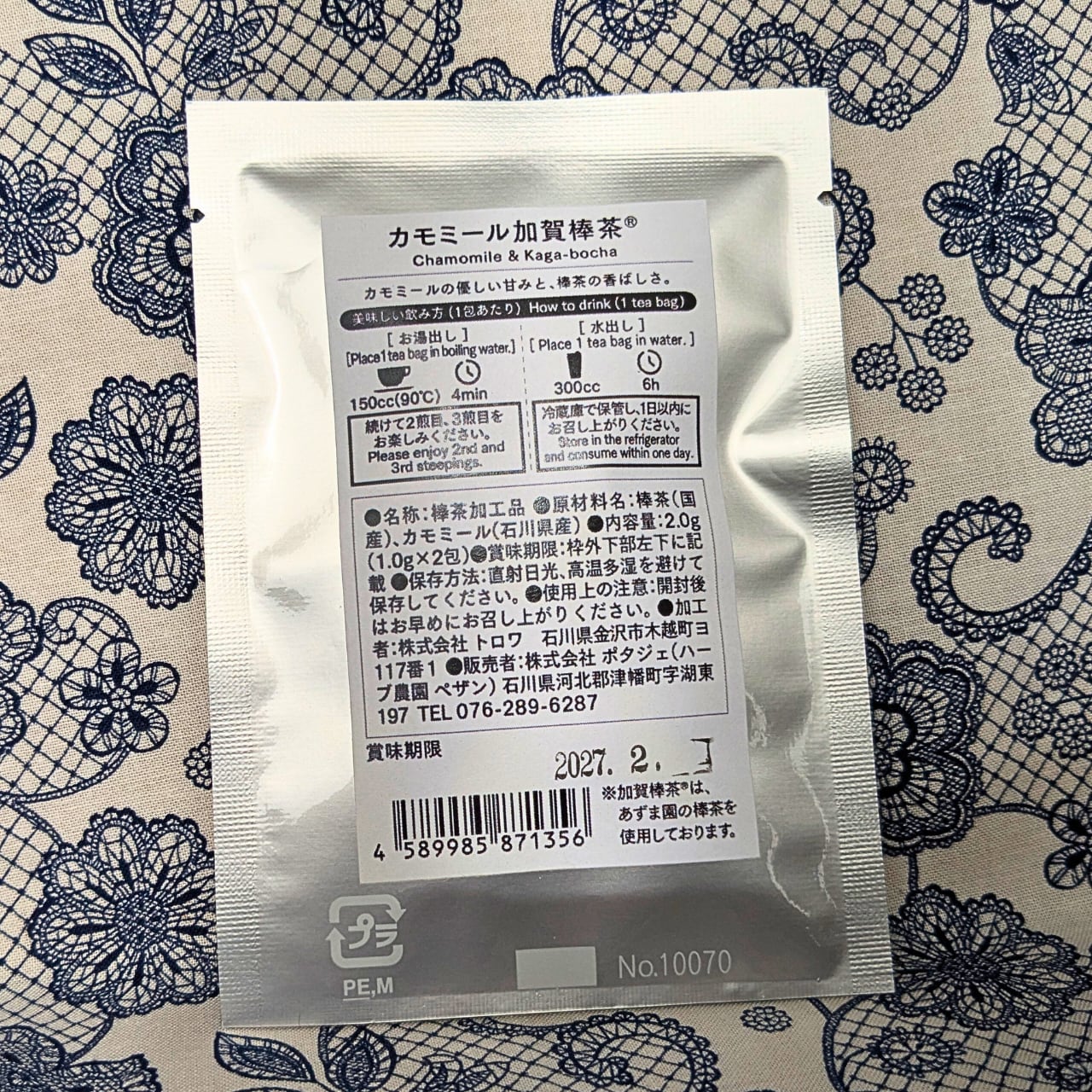 管理人の感想:自然豊かで太陽の恵みを受けて育ったPAYSANさんのカモミールと加賀棒ほうじ茶の織りなすハーモニーが絶妙です。一度ご賞味あれ♪